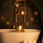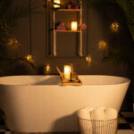 A white freestanding tub surrounded by lush greenery—ideal for dreamy portraits, product shots, or soft, creative visuals.